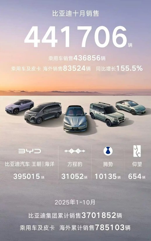 10月,比亚迪以441,706辆的销量创下年内新高,同比增长155.5%,呈现出绝对领先的市场地位。