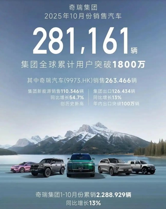 奇瑞集团10月份销售汽车281,161辆,同比增长3.3%。其中,新能源汽车销售110,346辆,同比增长54.7%,首次单月新能源超11万辆,表现非常强劲,创下历史新高。1-10月累计 697891辆,同比增长73.1%,规模稳居行业前五。