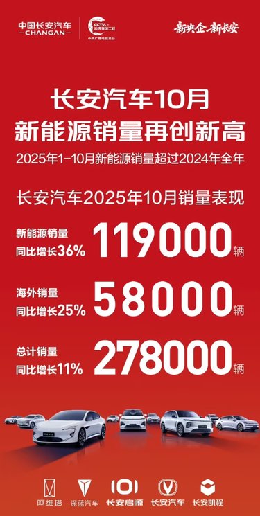 长安汽车2025年10月总销量为27.84万辆,同比增长11.00%;其中新能源汽车销量11.92万辆,同比增长36.14%,整体表现稳健,新能源领域增长显著。2025年1-10月新能源销量超过2024年全年。