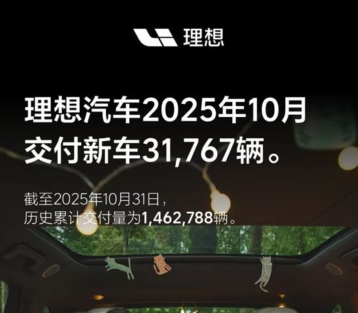 理想汽车10月交付31,767辆,截至2025年10月31日,历史累计交付量达1,462,788辆。