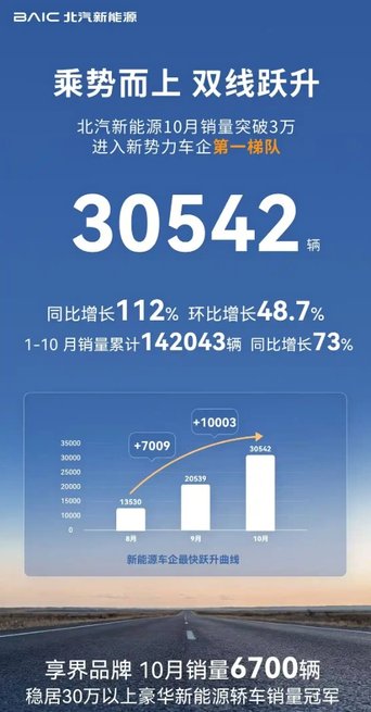 北汽新能源10月销量达30542辆,同比增长112%,环比增长48.7%。北汽新能源自8月以来销量持续攀升,实现了从1万+到2万+再到3万+的三级跳。