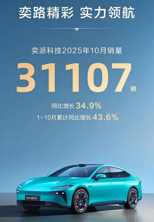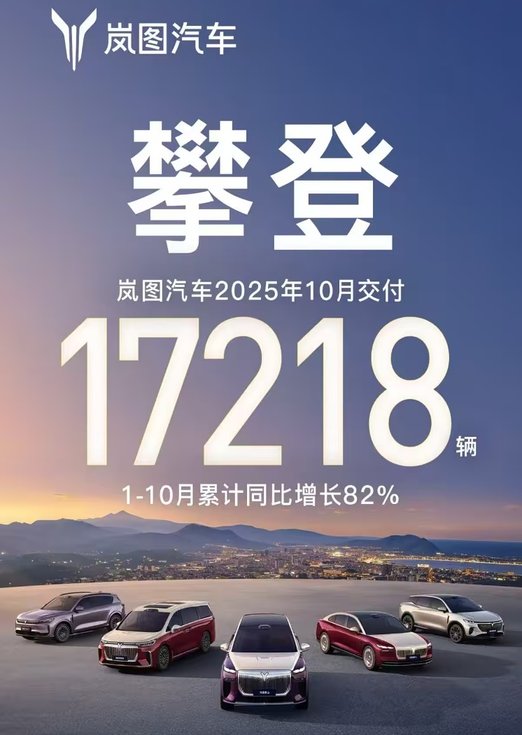 其中,旗下主要子品牌奕派科技销量达31107辆,同比增长34.9%,连续三个月突破3万辆。前10个月累计销量同比增长43.6%;岚图汽车交付17218辆,创历史新高,1-10月累计同比增长82%。