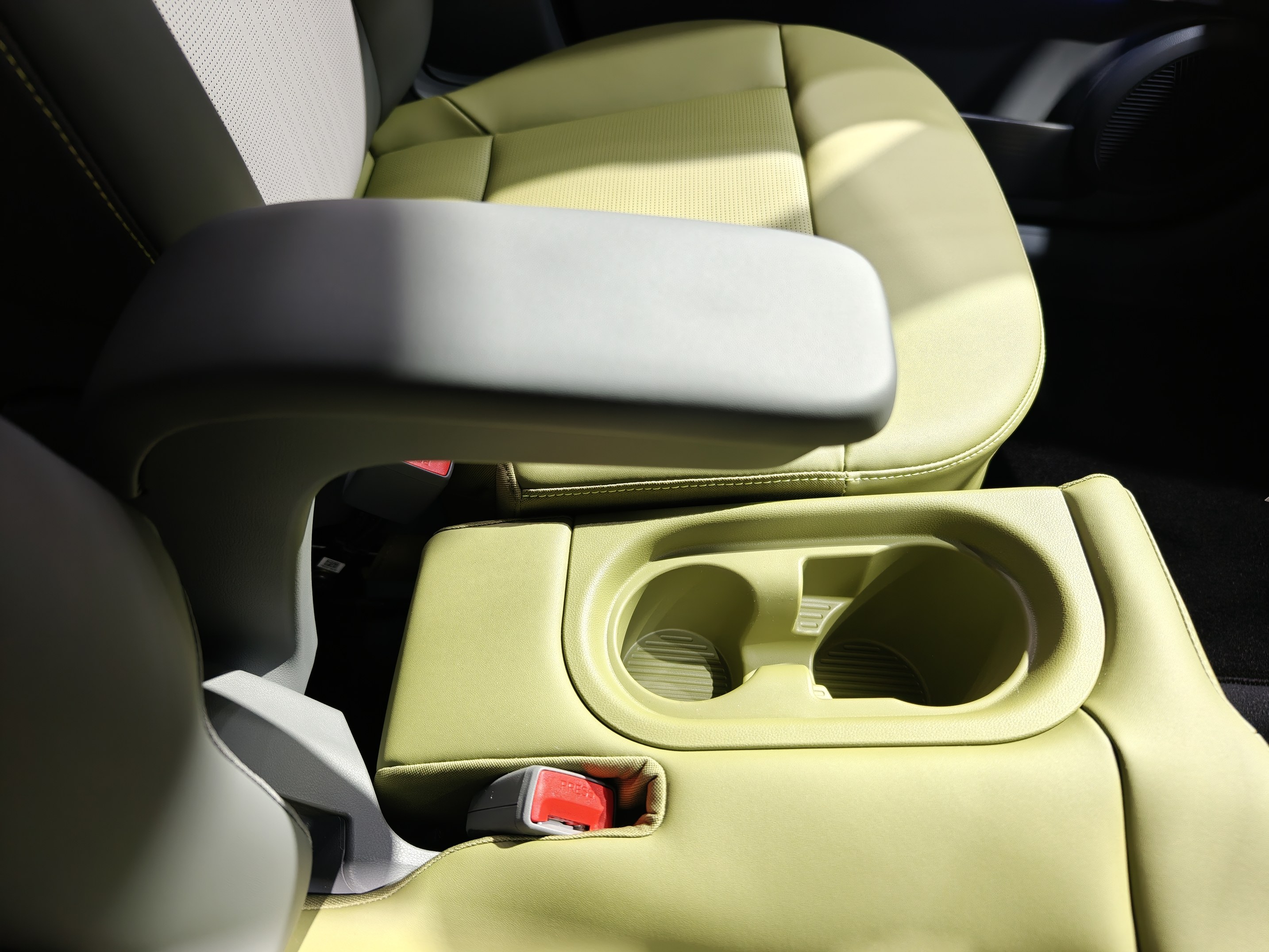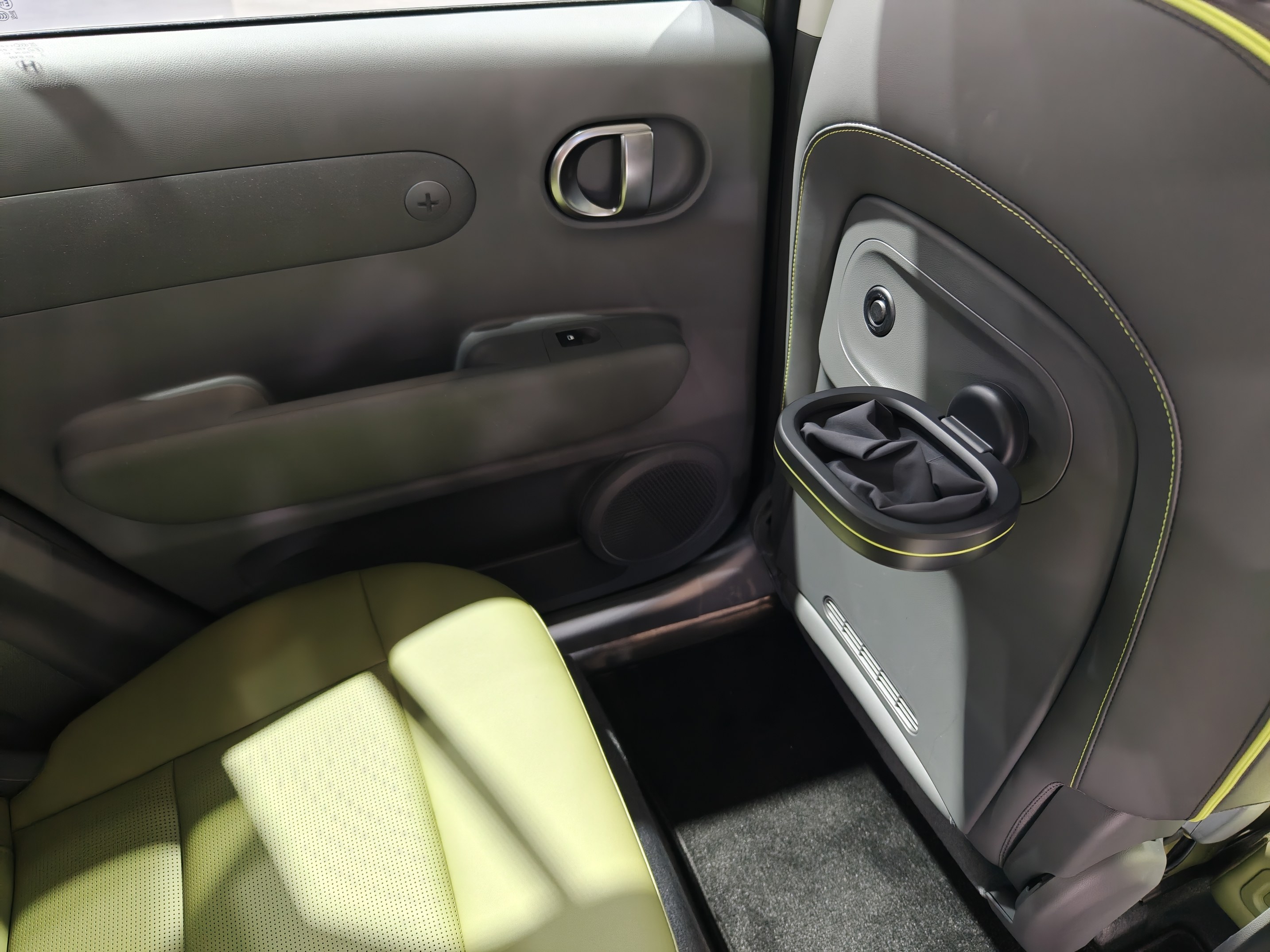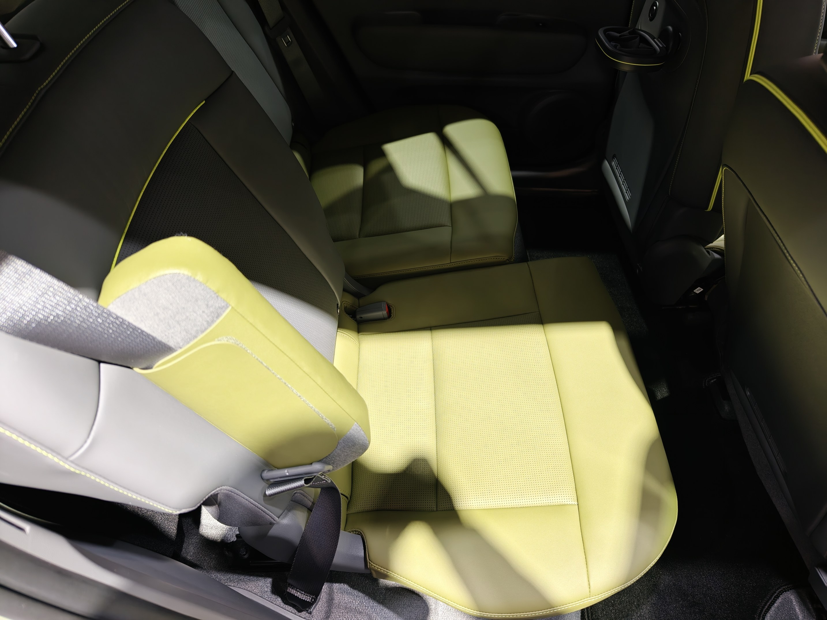 车内采用了荧光绿搭配黑色的内饰方案,前IP台上荧光绿主要是装饰条,座椅则是大面积的荧光绿,整体更加活泼。车内元素主要是现代家族式的圆形和椭圆设计,尤其是车门上有一块椭圆区域做了十字螺丝口设计,材质也做了区分,非常创新。前排集成式操作台有大量实体按键,同时还有一个储物格,前IP台中间也有贯穿储物格,并且把充电口和12V输出隐藏在里面。主驾座椅也提供了有个折叠扶手,并且这个扶手还是带弧线的L型,非常有设计感。