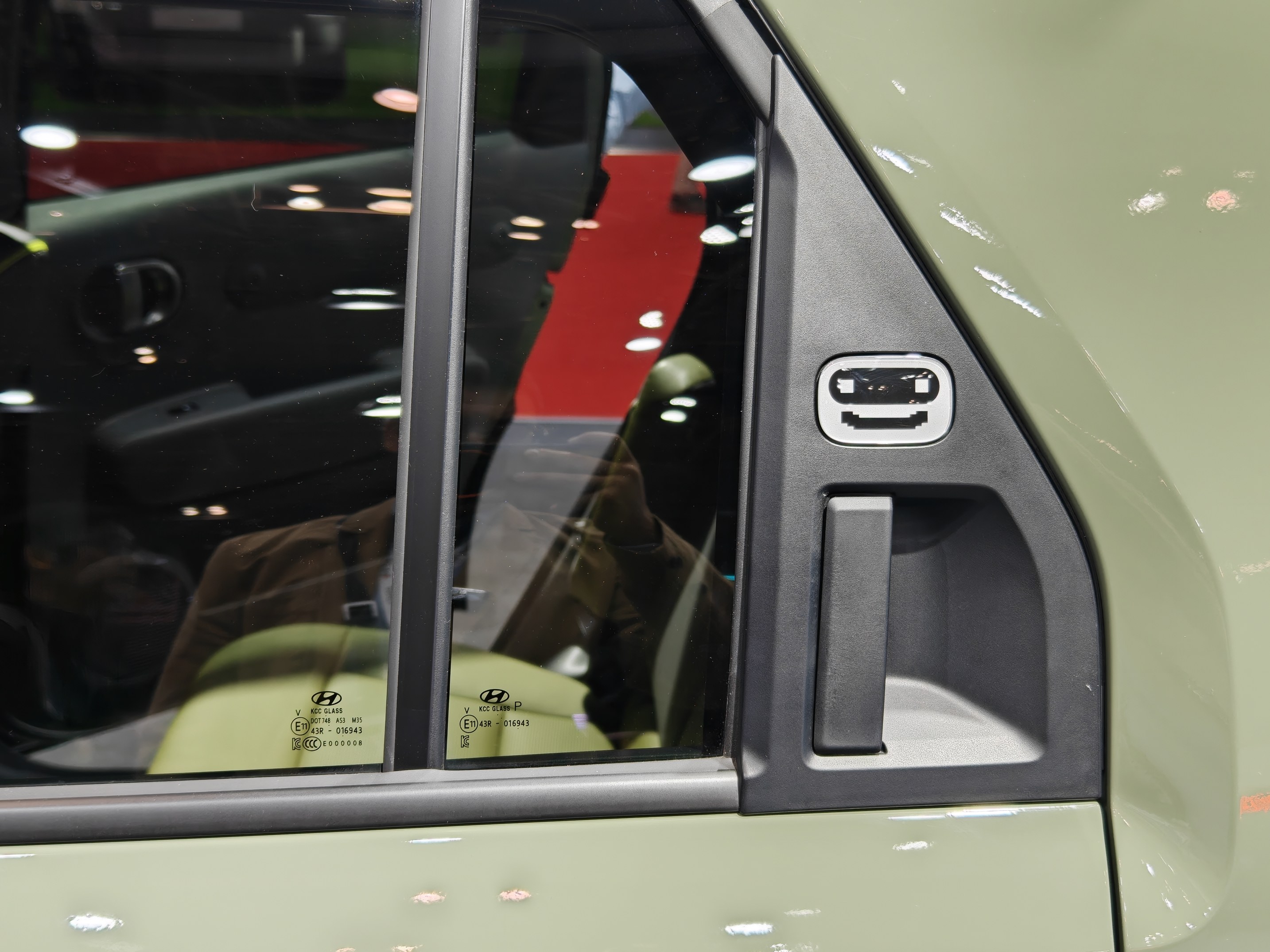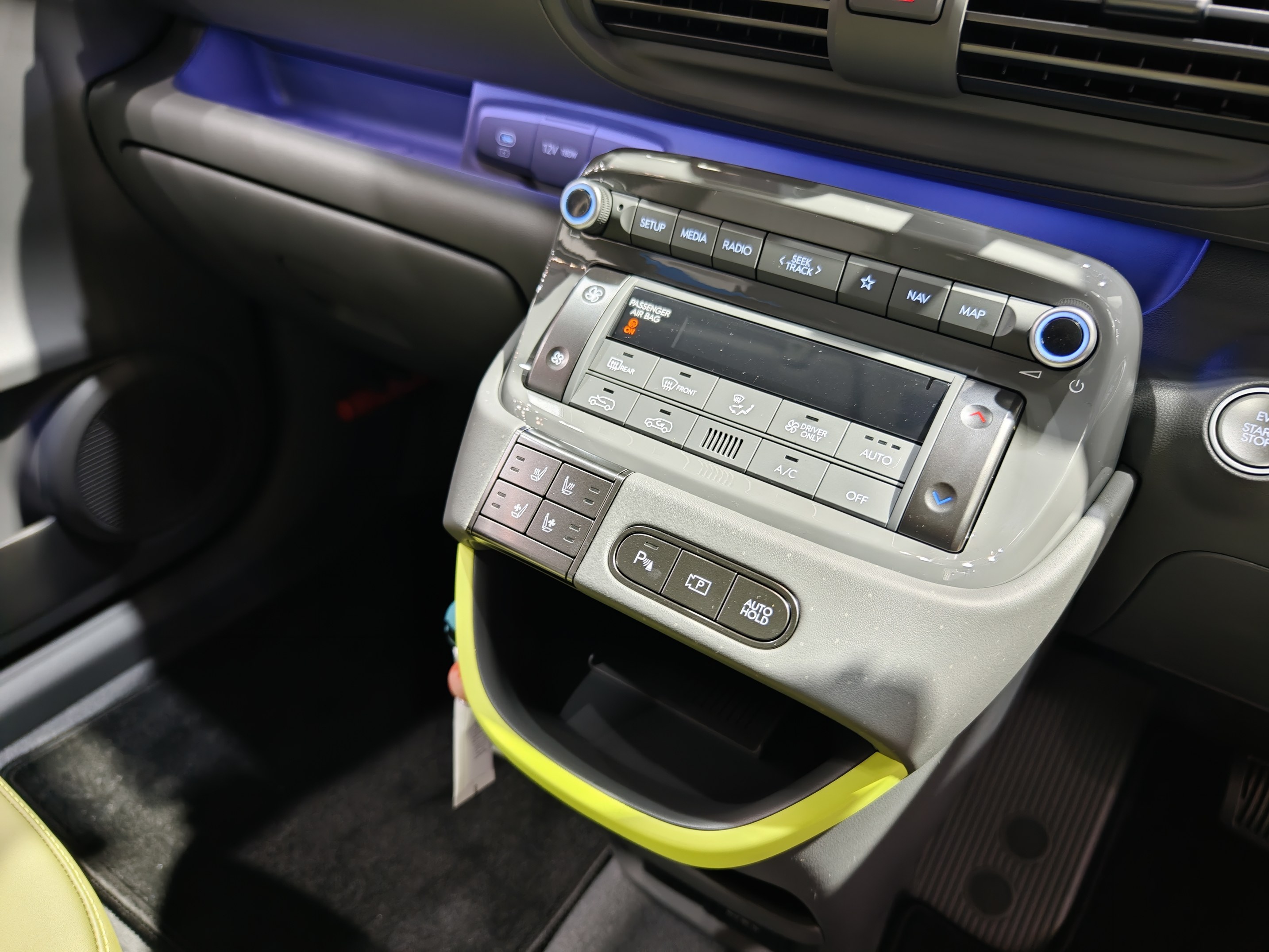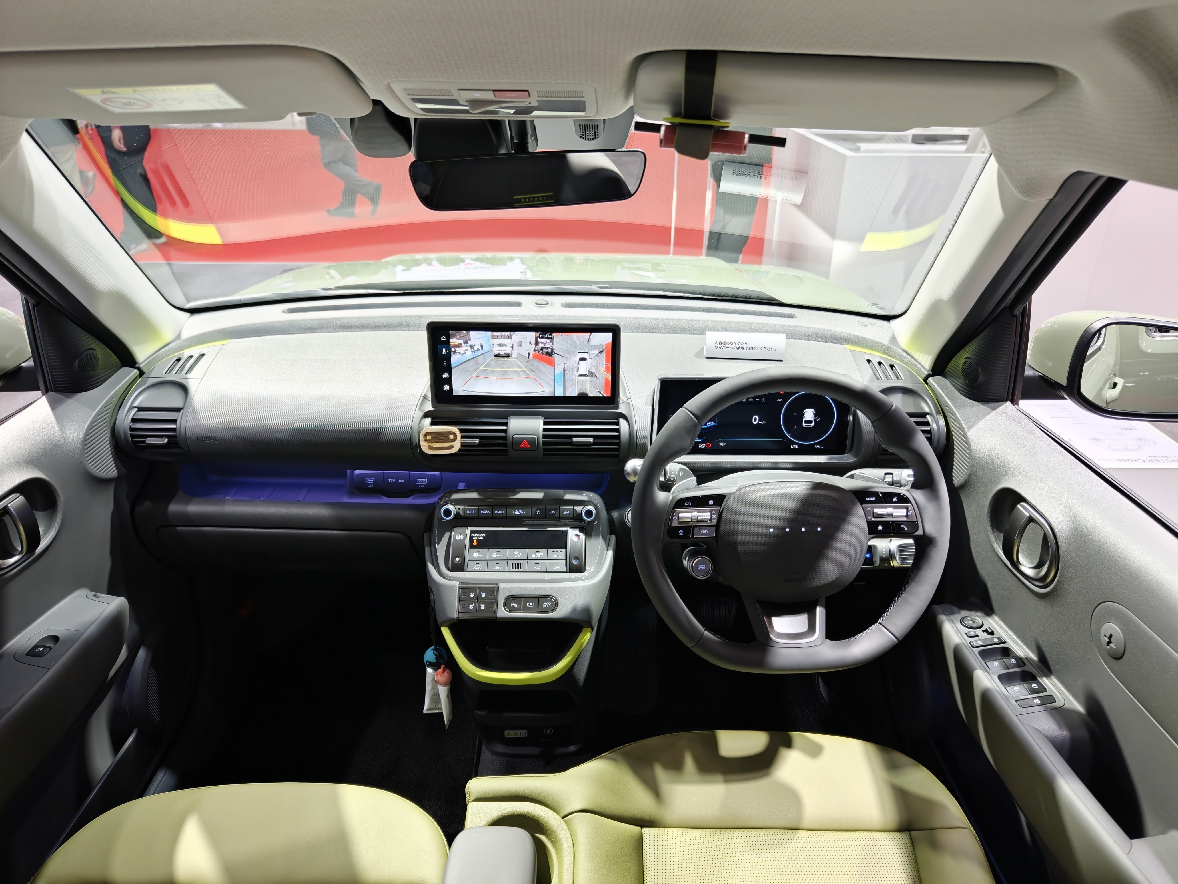 车内采用了荧光绿搭配黑色的内饰方案,前IP台上荧光绿主要是装饰条,座椅则是大面积的荧光绿,整体更加活泼。车内元素主要是现代家族式的圆形和椭圆设计,尤其是车门上有一块椭圆区域做了十字螺丝口设计,材质也做了区分,非常创新。前排集成式操作台有大量实体按键,同时还有一个储物格,前IP台中间也有贯穿储物格,并且把充电口和12V输出隐藏在里面。主驾座椅也提供了有个折叠扶手,并且这个扶手还是带弧线的L型,非常有设计感。