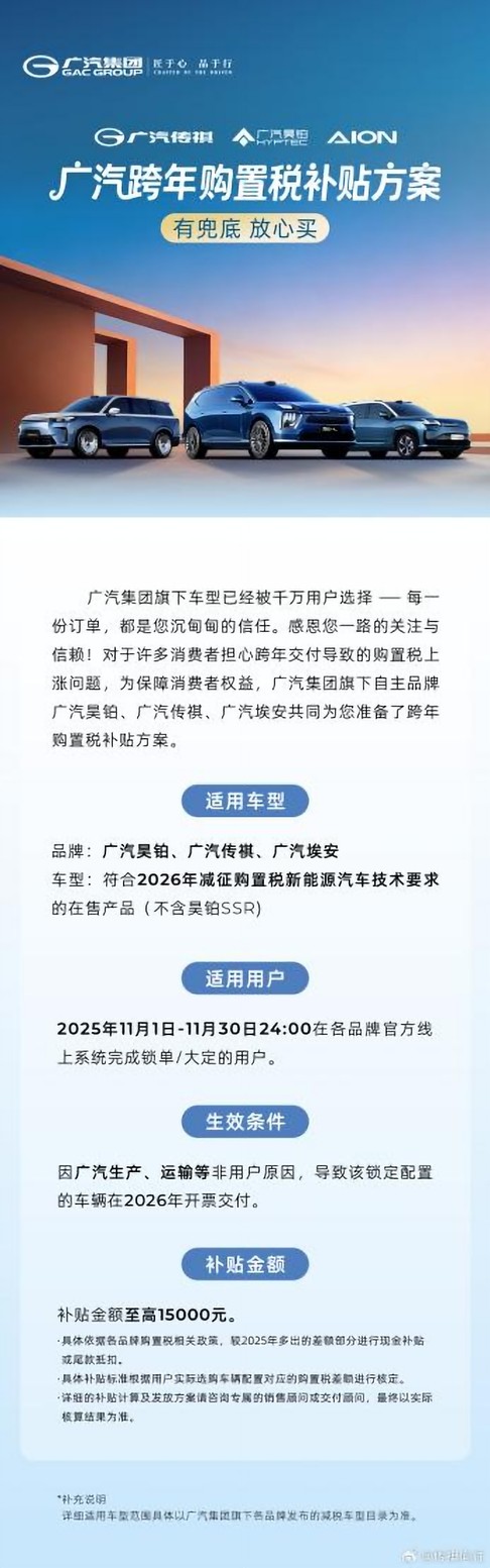 还是以传祺为例,他们近期推出的“品质选传祺,宠粉嘉年华”优惠政策几乎都适用于11月,与广东消费补贴时间高度重合。而且广汽还发布了跨年购置税补贴方案,11月30日前在官方线上系统完成锁单/大定,且因非用户原因造成2026年开票交付的,均可领取至高15000元的补贴。