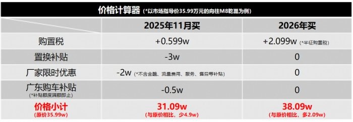 最后举个例子来总结一下,假设一位来自成都的王先生想在当地想购买市场指导价35.99万元的向往M8乾崑,他现在买和明年再买的价格竟然相差近7万!何时才是购车的最好时机,不用再多说了吧?更多未尽的优惠,详询当地经销商!