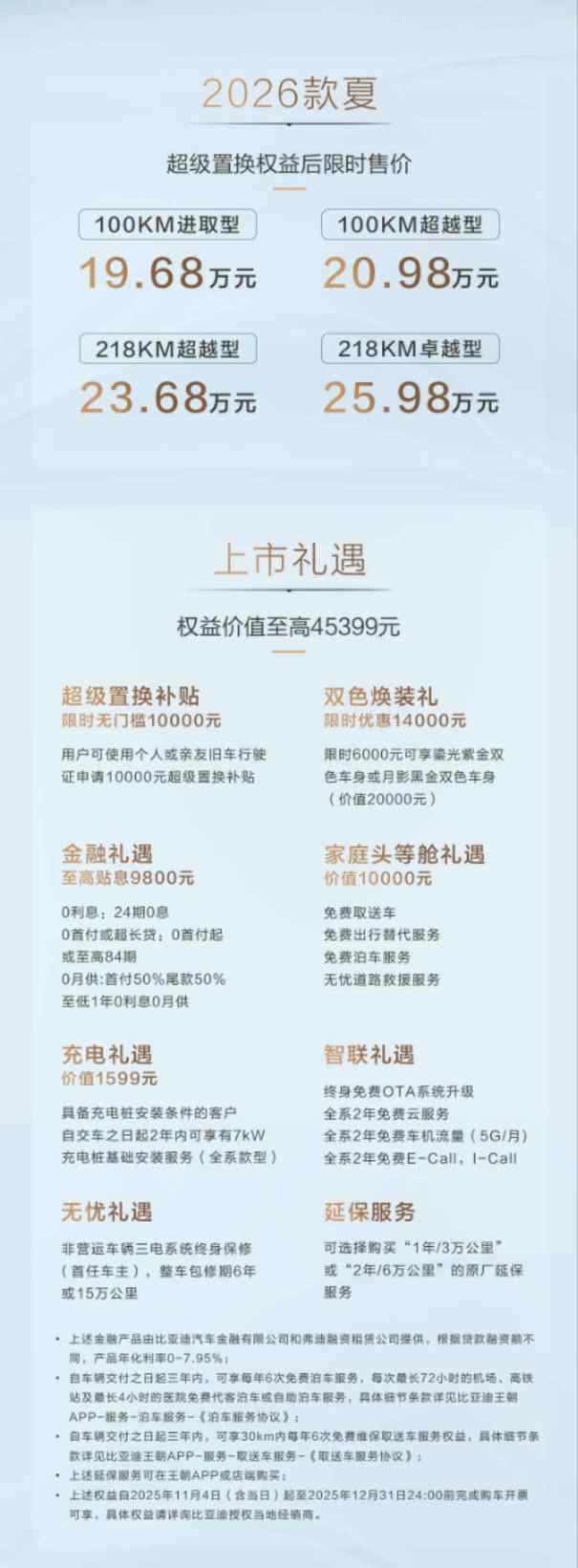 11月4日 比亚迪旗下中大型MPV——2026款夏正式上市,共推出4款配置,限时售价19.68万元起。新车以“家庭头等舱”为核心理念,通过一系列针对家庭用户痛点的创新性设计,在空间、智能、安全与舒适层面实现了对传统MPV的跨越,其颠覆性的产品定义与定价策略,预计将重新划定中大型家用MPV市场的竞争边界。