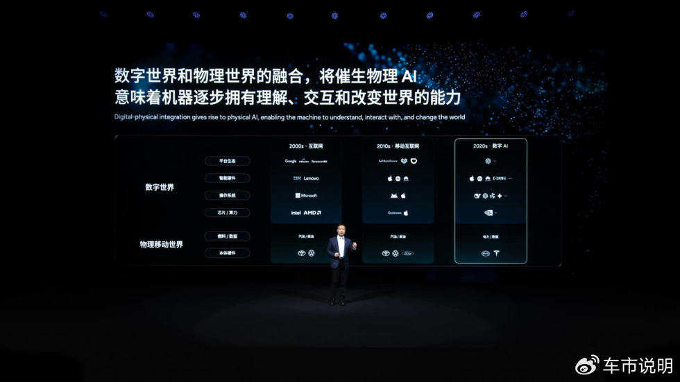 在发布会现场,何小鹏回顾了人类史上历次科技浪潮,并分享了他对科技浪潮的敏锐洞察:AI浪潮兴起,掀起了数字世界的全新革命。而在物理世界,电力取代石油成为主力燃料,新能源正在颠覆汽车百年工业。在他看来,当数字世界和物理世界融合,将催生“物理AI”。