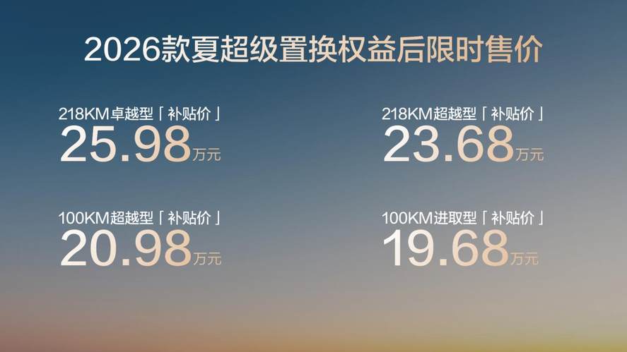 2025年11月4日,2026款夏正式上市,此次共推出4款车型,限时超级置换价19.68—25.98万元。仅需中级SUV的价格,就可享有超越30万级的豪华配置。