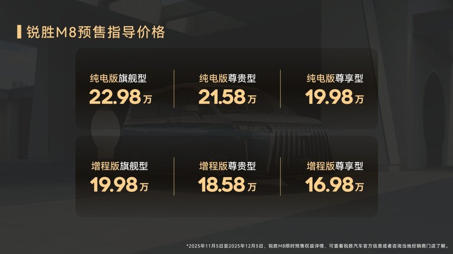 11月15日,锐胜M8正式开启预售,提供多种动力版本,预售价格分别为:锐胜M8-增程版169800元起,锐胜M8-EV版199800元起。