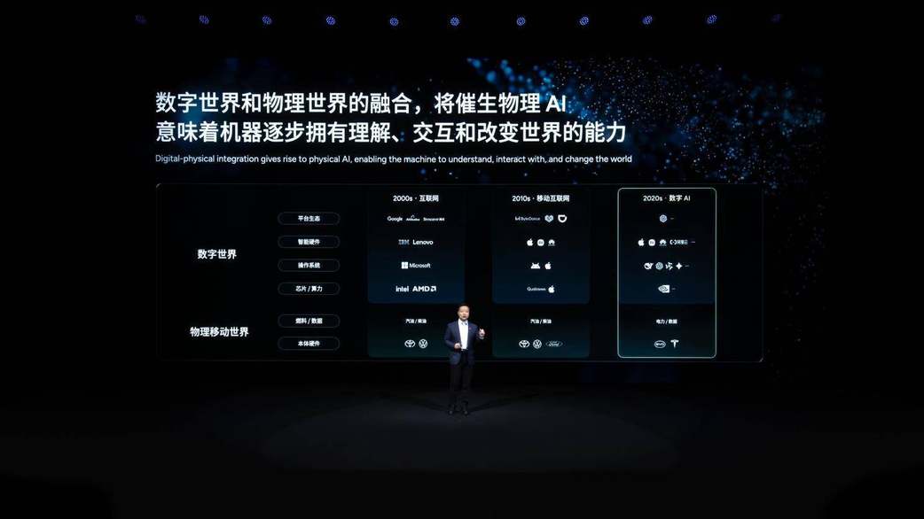 在发布会现场,何小鹏回顾了人类史上历次科技浪潮,并分享了他对科技浪潮的敏锐洞察:AI浪潮兴起,掀起了数字世界的全新革命。而在物理世界,电力取代石油成为主力燃料,新能源正在颠覆汽车百年工业。在他看来,当数字世界和物理世界融合,将催生“物理AI”。