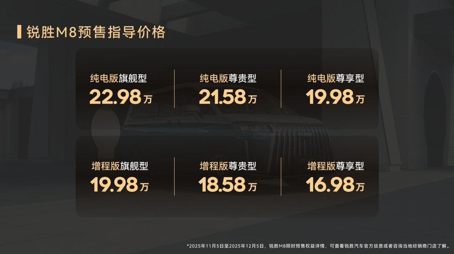 除了炸裂的产品力,锐胜 M8 更拿出满满诚意回馈用户,预售期间(2025 年 11 月 5 日 - 12 月 5 日)下订,即可尊享至高 2.98 万元的八项专属权益,从用车保障到增值服务全程无忧,原本 16.98 万起的定价就已极具竞争力,叠加限时福利后性价比直接拉满,错过这次可能要等一整年。