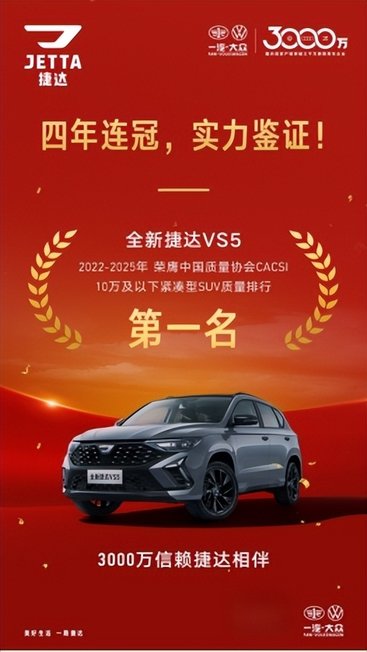 而捷达的品质实力,同样在权威评选中得到反复验证。根据中国质量协会发布的“中国汽车行业用户满意度指数(CACSI)”测评结果,捷达品牌旗下车型屡创佳绩。其中,捷达VS5表现尤为突出,自2022年起至2025年,已连续四年蝉联“10万及以下紧凑型SUV”用户满意度第一。 此外,捷达VA3、VS5、VS7也在2022年时,分别在其各自所处的细分领域夺得用户满意度第一名。这些荣誉,不仅是对捷达传承德系品质的肯定,更是一汽-大众深耕中国市场、精准满足用户需求的最佳证明。