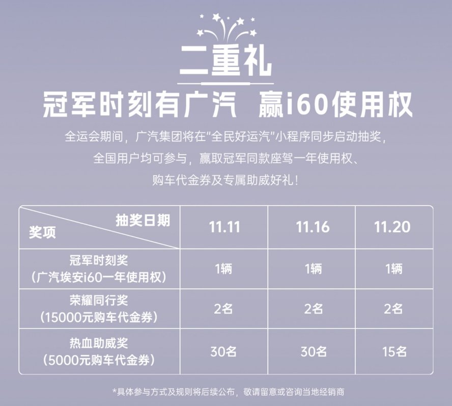 第十五届全运会期间,作为官方合作伙伴的广汽集团,在“全民好运汽”小程序同步推出抽奖活动,全国用户皆可参与!有机会赢取“冠军同款座驾埃安i60一年使用权”、“荣耀同行奖(15000元购车代金券)”以及“热血助威奖(5000元购车代金券)”等多重好礼!全民齐参与,好运“汽”到身边来!