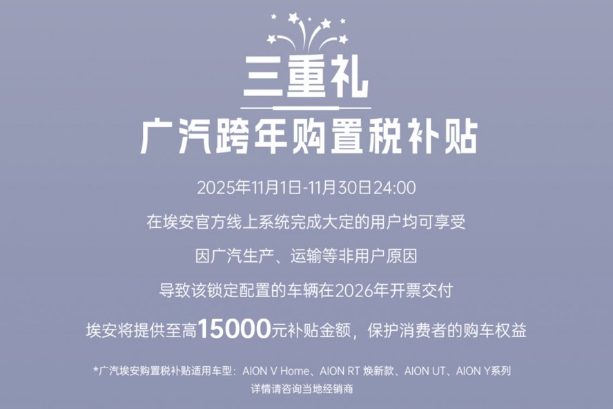 2025年11月1日至11月30日24:00期间,在广汽埃安官方线上系统完成大定的用户,如因生产、运输等非用户原因,导致锁定配置的车辆需延至2026年开票交付,埃安将提供至高15000元的补贴,切实保障消费者的购车权益,助您安心锁定心仪座驾!