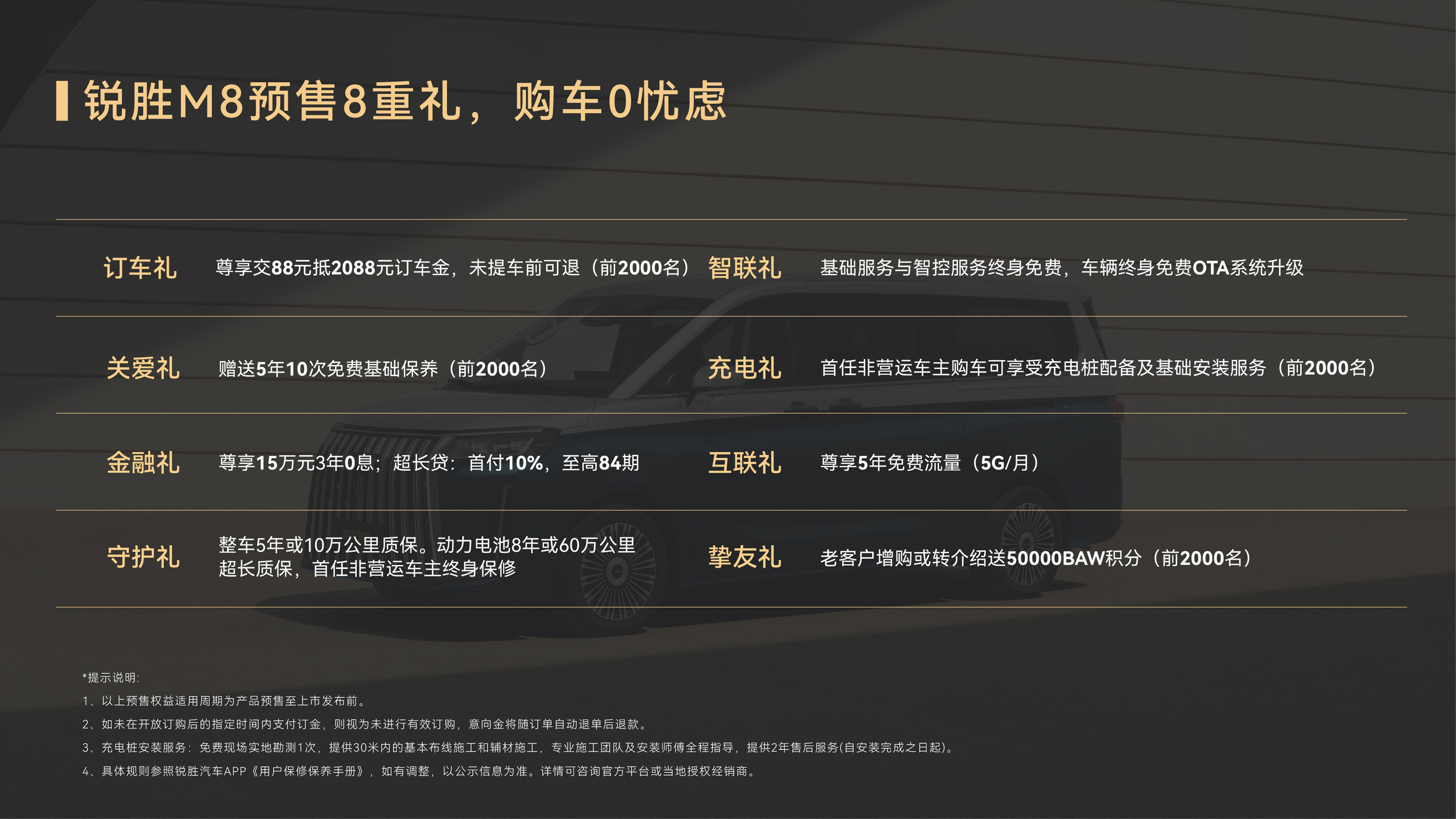 11月5日,锐胜M8开启预售,推出增程、纯电两种动力共6款车型,预售价16.98万-22.98万元。权益方面,首任车主享5年10次免费基础保养(前2000名),纯电版赠送充电桩及安装服务,增程版提供15万3年0息金融方案。这些权益均围绕降低用户长期使用成本,符合务实的消费需求。