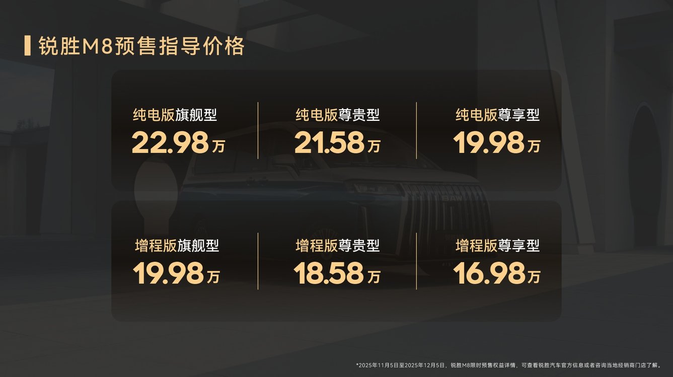 16.98万元起,锐胜M8开启预售,CLTC综合续航1420km