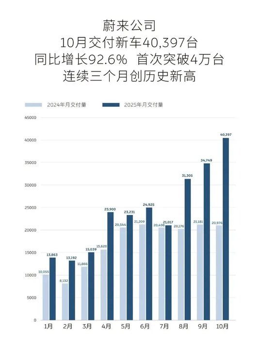10个月后的今天,蔚来果然交出了一份令人惊叹的成绩单:10月单月交付40,397台,首次突破4万大关,同比增长92.6%,连续三个月创下历史新高。截至10月,蔚来累计交付量已突破91.32万台,距离百万里程碑仅一步之遥。这也标志着,蔚来真正实现筑底反弹,正式进入快速发展上升通道。