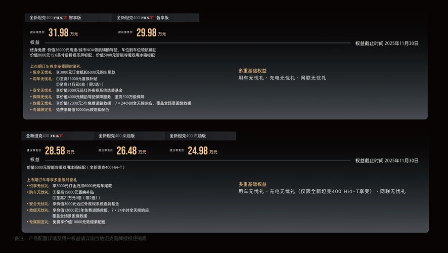 11月6日,全新坦克400在长城技术中心发布并同步开启交付,官方公布五款车型价格:汽油版24.98万元、柴油版26.48万元、Hi4-T 28.58万元、Hi4-T智享版29.98万元、Hi4-Z智享版31.98万元。发布会当日完成首位车主交付,AG超玩会“梦泪”在魏建军陪同下参观智能实验室、高环跑道与测试山并试乘试驾,新车“上市即交付”的节奏在现场落地。活动设置“紫气东来”等打卡区与潮酷生活展陈,营造年轻化氛围。
