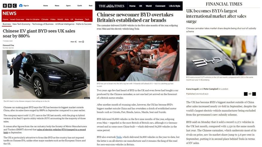 比亚迪在英国市场的高速增长,也吸引了英国主流媒体的高度关注。英国广播公司(BBC)报道“中国电动汽车巨头比亚迪9月英国销量创下新高”;《泰晤士报》则以“中国新晋品牌比亚迪超越英国老牌汽车品牌”为题,指出“两年前英国几乎没人听说过比亚迪”;《金融时报》更进一步强调“英国成为比亚迪最大的国际市场”。