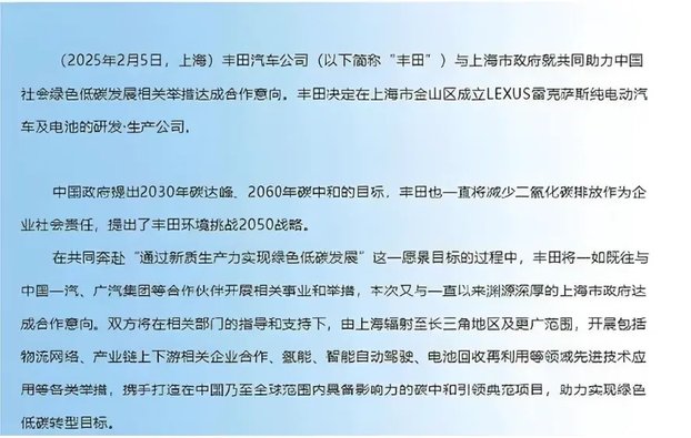 而2025年丰田在本土化事业领域的“最大手笔”,莫过于决定在中国研发生产雷克萨斯电动化车型。今年2月,雷克萨斯(上海)新能源有限公司正式成立,由丰田全资持股,落户上海金山区。