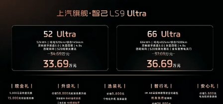 智己LS9目前推出了52 Ultra与66 Ultra两款车型,两车差价3万元,主要体现在电池容量与续航上。52 Ultra的CLTC纯电续航为320km,综合续航1454km,66 Ultra的CLTC纯电续航达402km,综合续航1508km。从配置上看,两款车型都相当丰富,800V架构、激光雷达、英伟达Thor芯片、B&O音响、主驾及二排右座4D机械按摩、全车三把零重力座椅等亮点配置,两款车均有配备。