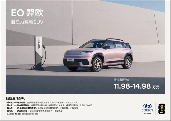 这款定位“新质力纯电SUV”的新车,以11.98-14.98万元的亲民售价,直面中国新能源汽车市场最具竞争力的10-20万价格区间。作为北京现代新能源战略的“开篇之作”,EO羿欧的到来不仅意味着北京现代从“燃油时代”迈入“油电并进”的关键跨越,更以“战略落地+产品破局”双引擎,展现合资品牌新能源崛起的强烈信号。