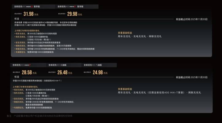 动力配置上,坦克400提供燃油、混动、柴油三种动力组合的五款车型,价格覆盖24.98万至31.98万元区间。其中Hi4-Z智享版搭载的泛越野超级电混架构,综合功率达300kW,纯电续航150km,兼顾城市通勤零油耗与野外穿越高续航;柴油版则采用2.4T+9AT黄金组合,峰值扭矩480N·m,配合三把差速锁与坦克掉头功能,可征服45°陡坡及800mm涉水深度。长城汽车特别强调,全系标配的智能适时四驱系统能根据路况0.1秒自动切换驱动模式,实现“全地形无感切换”。