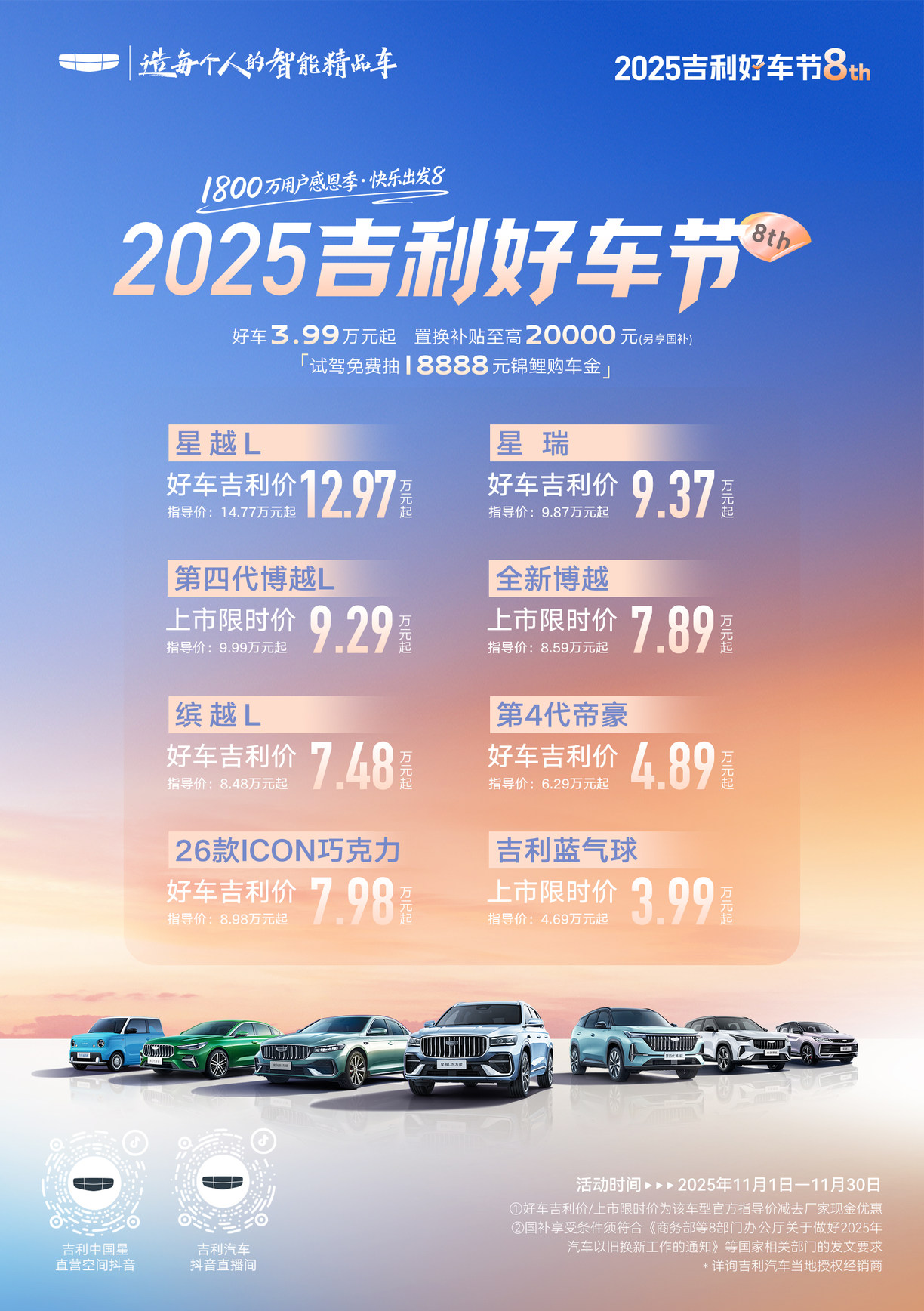 11月1日至11月30日,以“感恩1800万用户”为核心的第8届2025吉利好车节正式启幕。作为吉利汽车年末规模最大的购车盛事,本届活动延续“好品质、好价格、好福利”核心主张,集结中国星、博系、缤系、豪系等主力燃油车型矩阵,通过超低价购车、多重补贴叠加、全平台福利派送以及线下狂欢等多元回馈形式,为全国消费者带来一站式高价值购车体验,以实打实的优惠与服务,致谢千万用户多年来的信赖与陪伴。