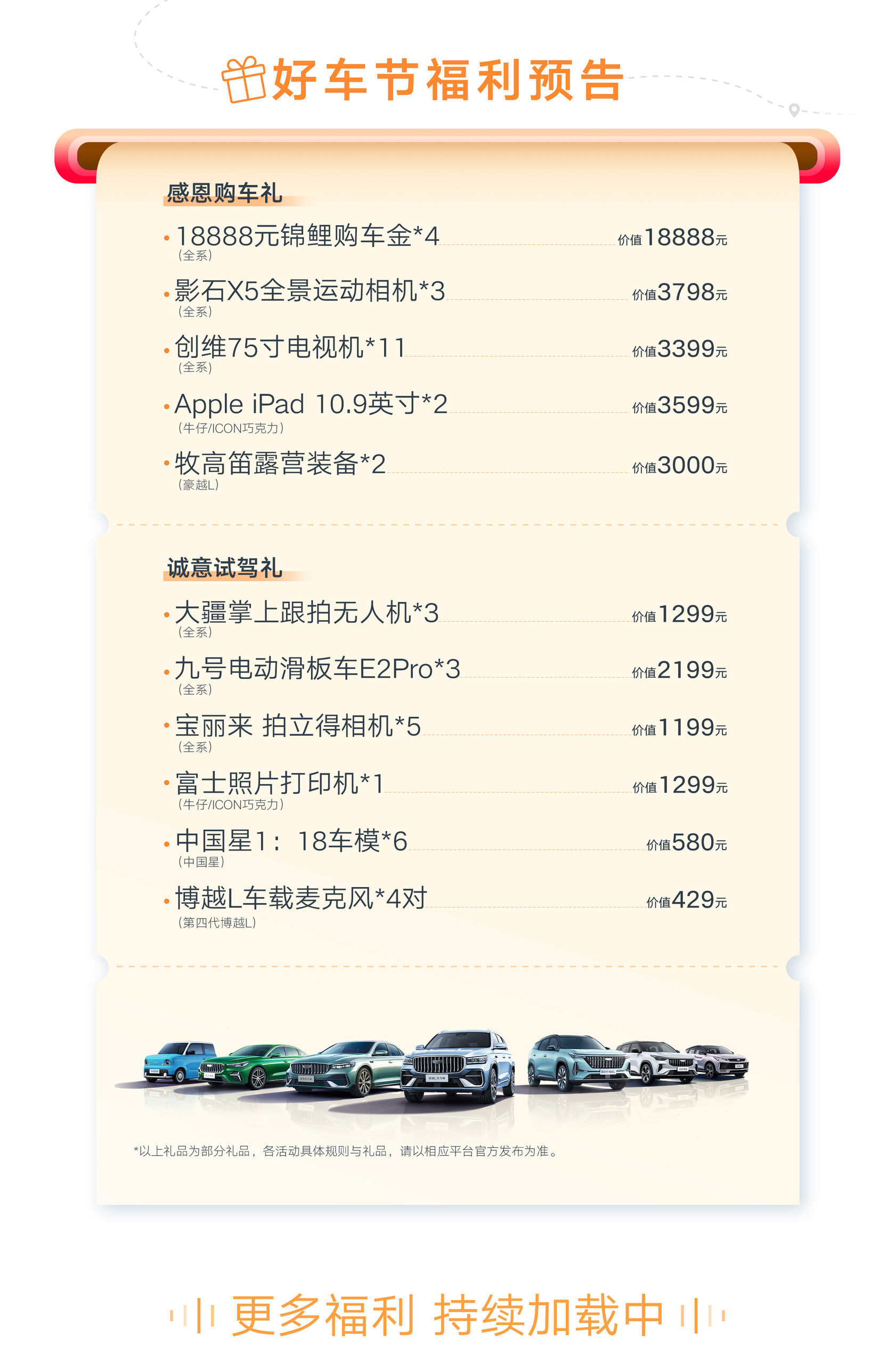 以1800万用户感恩季为契机,吉利汽车同步推出“吉利中国・暖冬”年终用户答谢、秋季售后关爱、发口碑贴赢吉分等系列增值活动,从购车到用车全周期回馈用户。消费者可通过吉利汽车官方公众号、抖音号等官方渠道,实时关注活动动态,解锁更多专属权益。