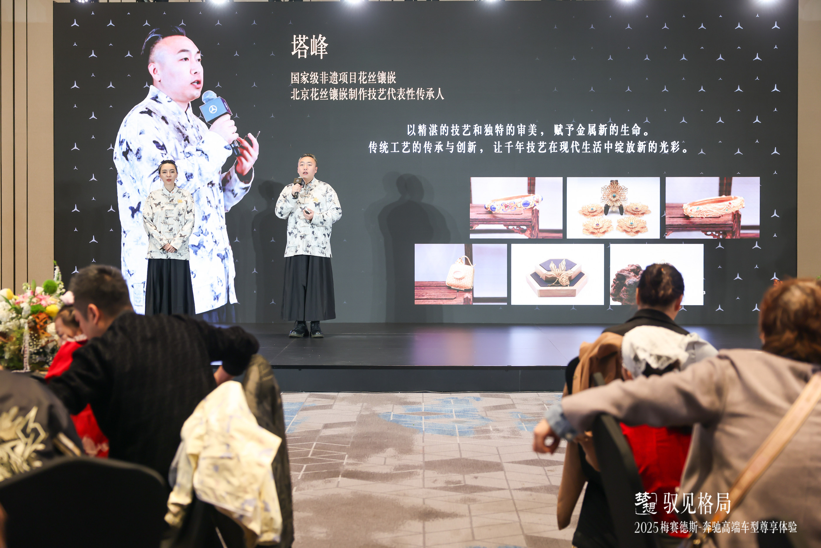 活动伊始,国家级非遗项目花丝镶嵌制作技艺代表性传承人塔峰先生亲临现场,为大家介绍了花丝镶嵌这项传承千年的宫廷技艺。在塔峰先生的指导下,嘉宾们饶有兴趣地参与了手工制作檀木无事牌的活动。一凿一刻间,不仅体验了传统手工艺的精妙,更感受到了奔驰品牌与匠心精神的高度契合。