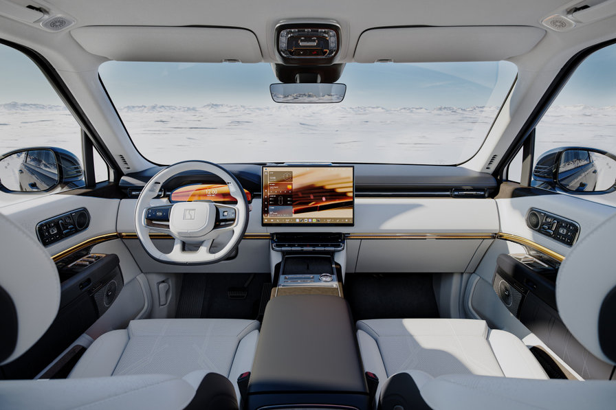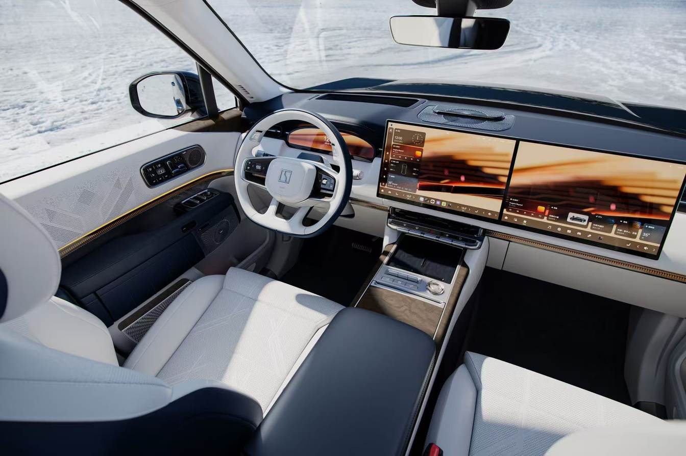 我这次试驾的是一台“极夜黑”配色车型。如果说浅色系彰显的是科技与未来感,那么黑色则将它的霸气与深邃渲染到了极致。深邃如子夜苍穹的车身,将全球SUV最大的一体式格栅、浩瀚星钻矩阵大灯融为一体,静默中透露出不怒自威的强大气场。车身侧面采用飞桥游艇式车顶设计,线条流畅而富有张力,在黑色车身上更显修长优雅,仿佛一艘“陆上游艇”。