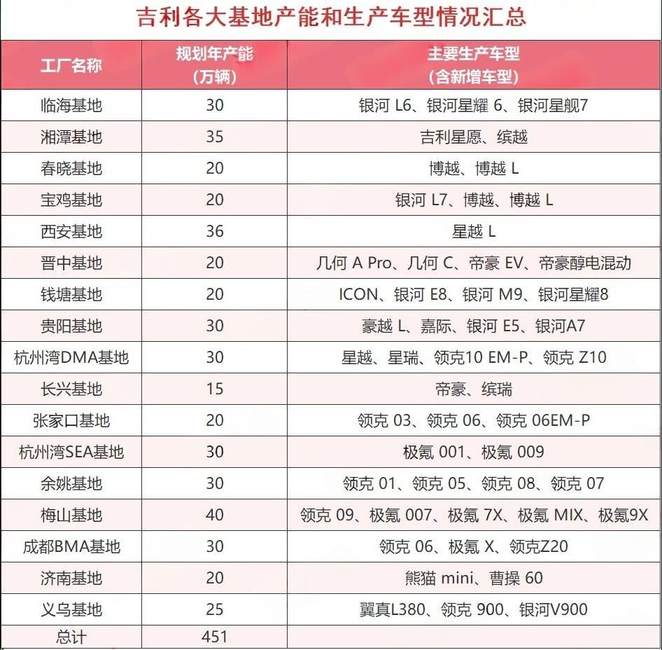 其中,吉利大本营浙江最多,其他的分布在湖南、贵阳、四川、西安、河北、山西、山东等地,实际规划产能约450万台。