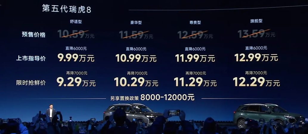 大家好,我是大李。11月10日,全新瑞虎8正式上市,官方指导价9.99-12.99万元,限时低至9.29-12.29万元,新车不仅提供了双前脸设计,更在空间、智能配置上全面升级,全系搭载1.6T发动机匹配7速湿式双离合变速箱,接下来咱们就来具体聊聊。
