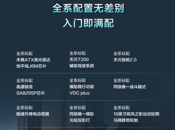 智能配置方面,新车首发搭载天元T200辅助驾驶系统,全系配备禾赛科技ATX激光雷达和29个感知硬件,标配20多项驾驶辅助功能,支持高速NOA、全场景智慧泊车等高阶功能。
