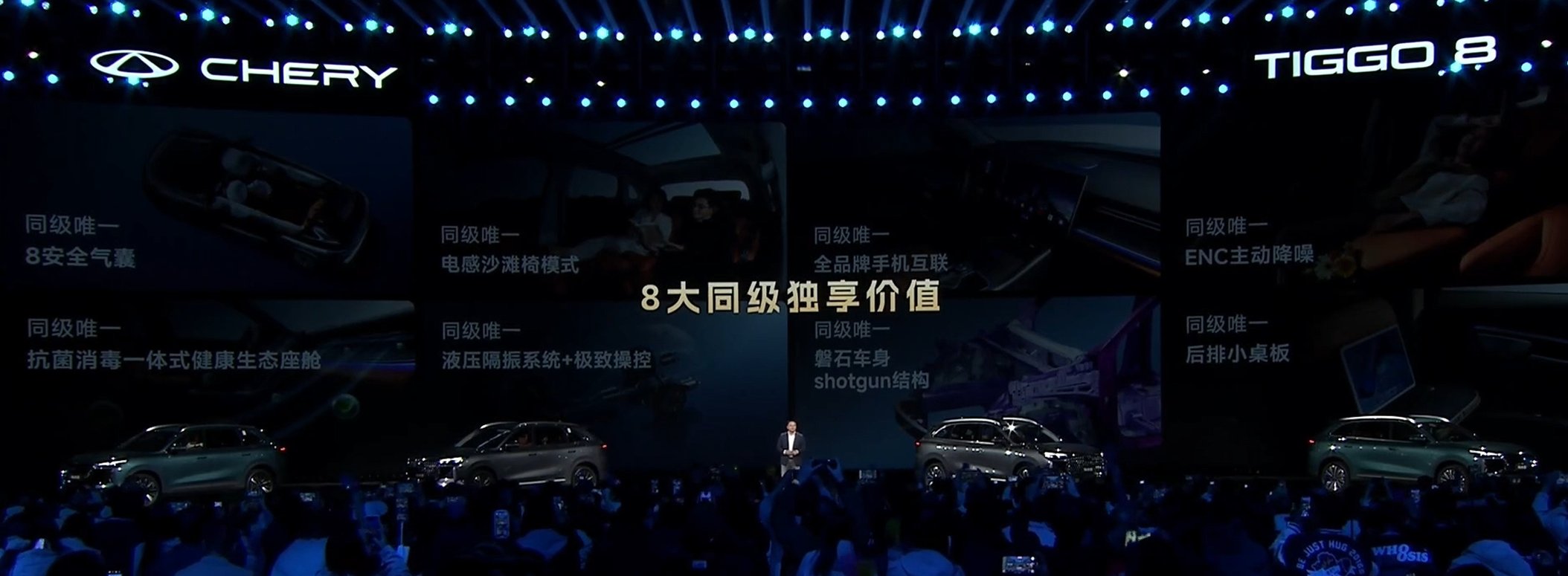 作为在同级燃油SUV中的差异化优势,第五代瑞虎8拥有“同级8大唯一”配置,分别有同级唯一8安全气囊系统、同级唯一电感沙滩椅模式、同级唯一全系标配高通8155芯片、同级唯一搭载AI语言大模型支持四音区交互、同级唯一抗杀一体式健康生态座舱、同级唯一支持全品牌手机互联映射、同级唯一10层云感SPA座椅以及同级唯一配备航空级承重小桌板,这些使得第五代瑞虎8在10万级燃油SUV市场中具备了独特的竞争力。