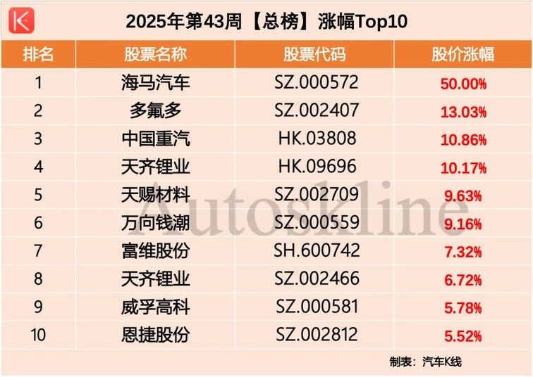 除海马汽车出现飙涨外,上周多氟多、中国重汽H股和天齐锂业H股涨幅超过10%,表现相对较强。