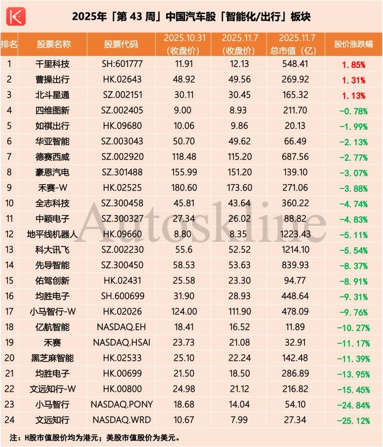 具体来看,领跌的文远知行和小马智行美股,跌幅分别达到25.12%和24.84%;这两家国内头部自动驾驶企业11月6日同时在港股挂牌,不料却双双遭遇破发,投射出资本市场的谨慎态度。