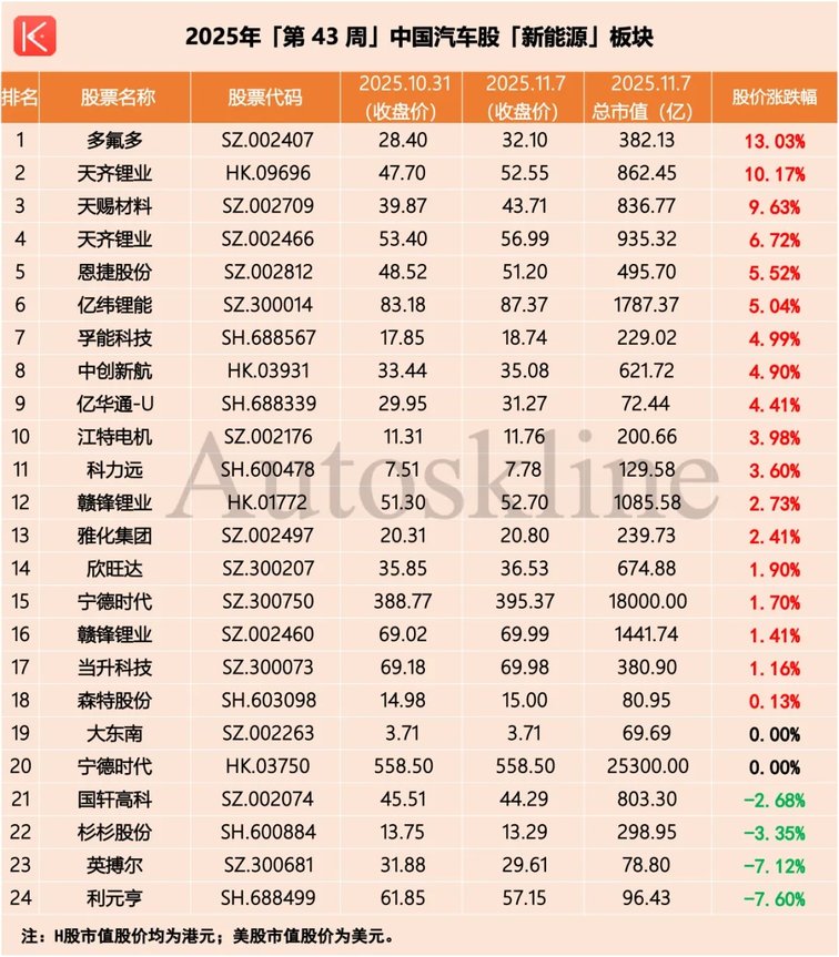 天齐锂业H股则在上周实现小V反弹,后三个交易日连续上扬,周度上涨10.17%;11月10日,该股再度上涨3.04%,股价刷新52周新高57.1港元/股。