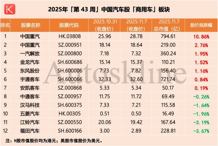 中国重汽H股11月6日盘中股价刷新52周新高29.92港元/股,周度上涨10.86%。