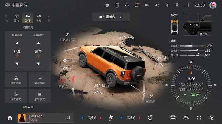 与此同时,系统通过车身多个智能传感器实时监测车辆姿态,中控屏上的越野专家模式可同屏显示超过30项越野参数。从四驱状态、差速锁状态到每个轮胎的实时胎压,信息检索无需左顾右盼,一切了如指掌。对于潜在的大幅度俯仰、侧倾风险,系统会提前发出清晰预警,极大提升了复杂地形下的操控信心。全系标配的智能四驱系统与前/后机械式差速锁,提供了强大的牵引力与脱困底气;而低至2kph的蠕行模式,则在长下坡路段展现出极致精准的控车能力,驾驶者只需专注方向,系统自动控制车速与扭矩,稳如磐石。