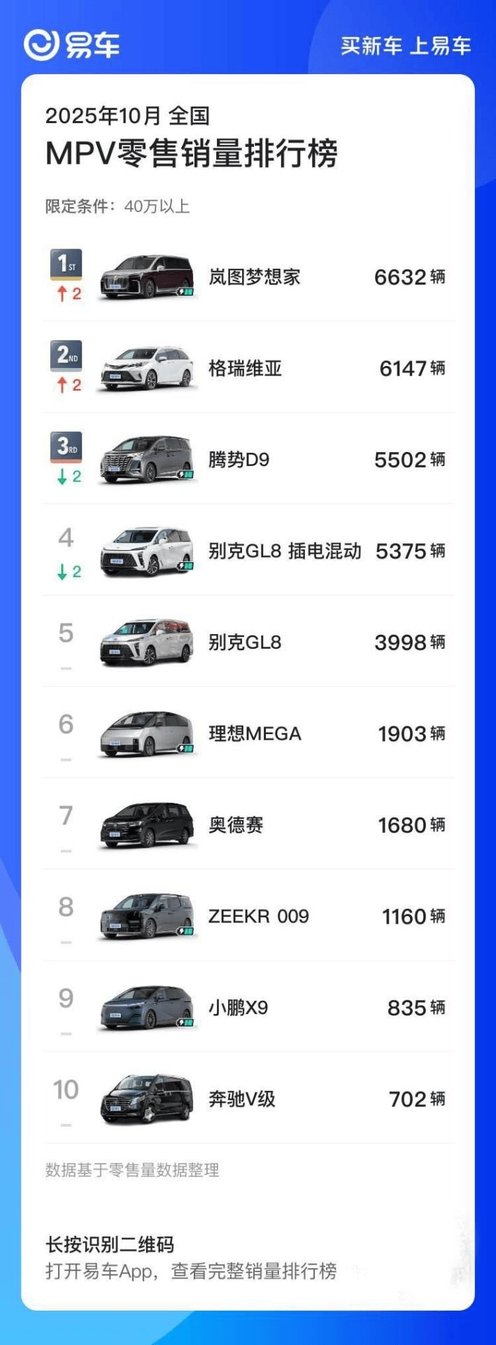 岚图梦想家10月售6632台,蝉联高端MPV市场销冠