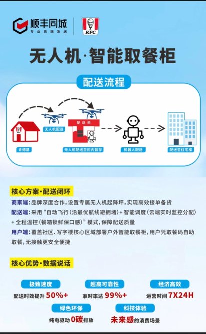 据悉,本次顺丰同城受江岸区政府及百胜餐饮(武汉)邀请,深度整合无人机、无人车、楼宇机器人及智能取餐柜等多元设备,联合打造了一套空中与地面立体化无人智慧餐配方案,实现全程无人化、精细化配送。