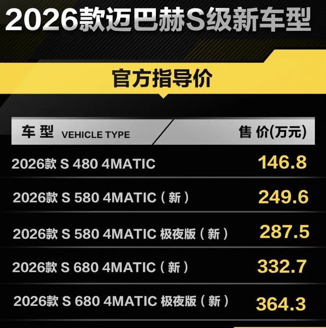 取消手势控制,249.6万元起,2026款迈巴赫S级上市