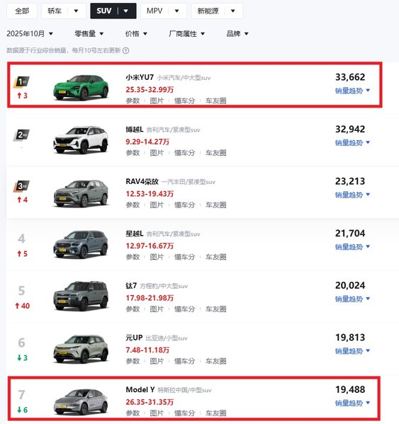 今年10月份的SUV销量榜,见证了一场历史性的更迭。小米YU7领衔主演,上演了一场对特斯拉Model Y的“屠榜”大戏。