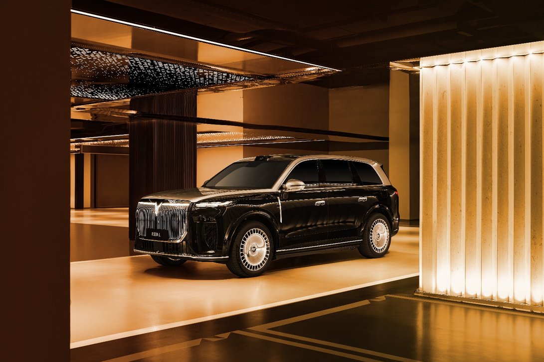 而令其在发运途中便自成焦点的,则是其磅礴气韵与东方美学设计。车身超5.2米、宽超2米,呈现出“山海万壑”般的磅礴体态。前脸34根光瀑华柱格栅与“天地之镜”轮毂,静止时如收纳苍穹,行进时尽显王者姿态。细节处,“日月同辉”大灯、“山海倒影”尾灯,以及门把手上的“流光星辰”点阵,皆在方寸间植入东方意象,向世界宣告:中式豪华,自有其道。
