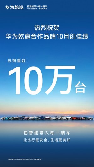11 月 10 日消息,华为乾崑智能汽车解决方案官方微博发布捷报:其合作品牌在刚刚过去的10月份创下销量新纪录,整体销量突破10万台大关。这一数字背后,是华为智能汽车解决方案从技术尝鲜走向规模商用的重要转折。