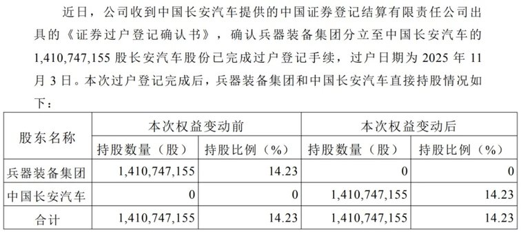 随着一纸《证券过户登记确认书》送达,其原间接控股股东中国兵器装备集团有限公司(简称“兵装集团”)所持有的14.23%长安汽车股份,正式过户至新设立的中国长安汽车集团有限公司(以下简称“中国长安汽车”),后者以合计持有35.04%股份,成为长安汽车间接控股股东。
