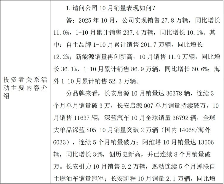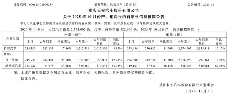 就在股份完成过户前两天,长安汽车发布10月产销快报。