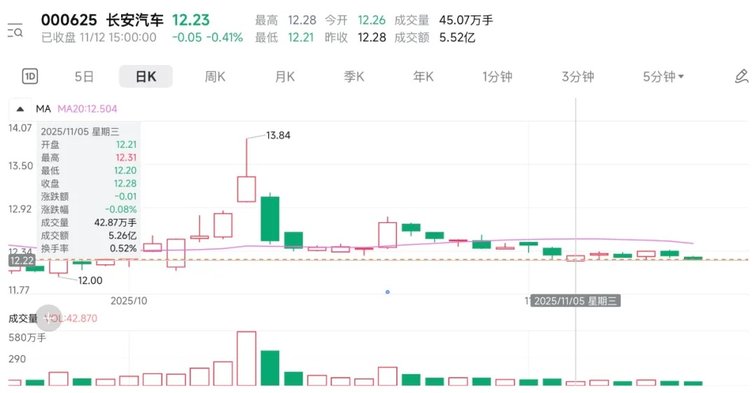 10月销量数据发布后,11月3日长安汽车股价仅微涨0.24%;官宣股份过户完成次日(11月5日)微跌0.08%;截至11月12日收盘,报收12.23元/股。